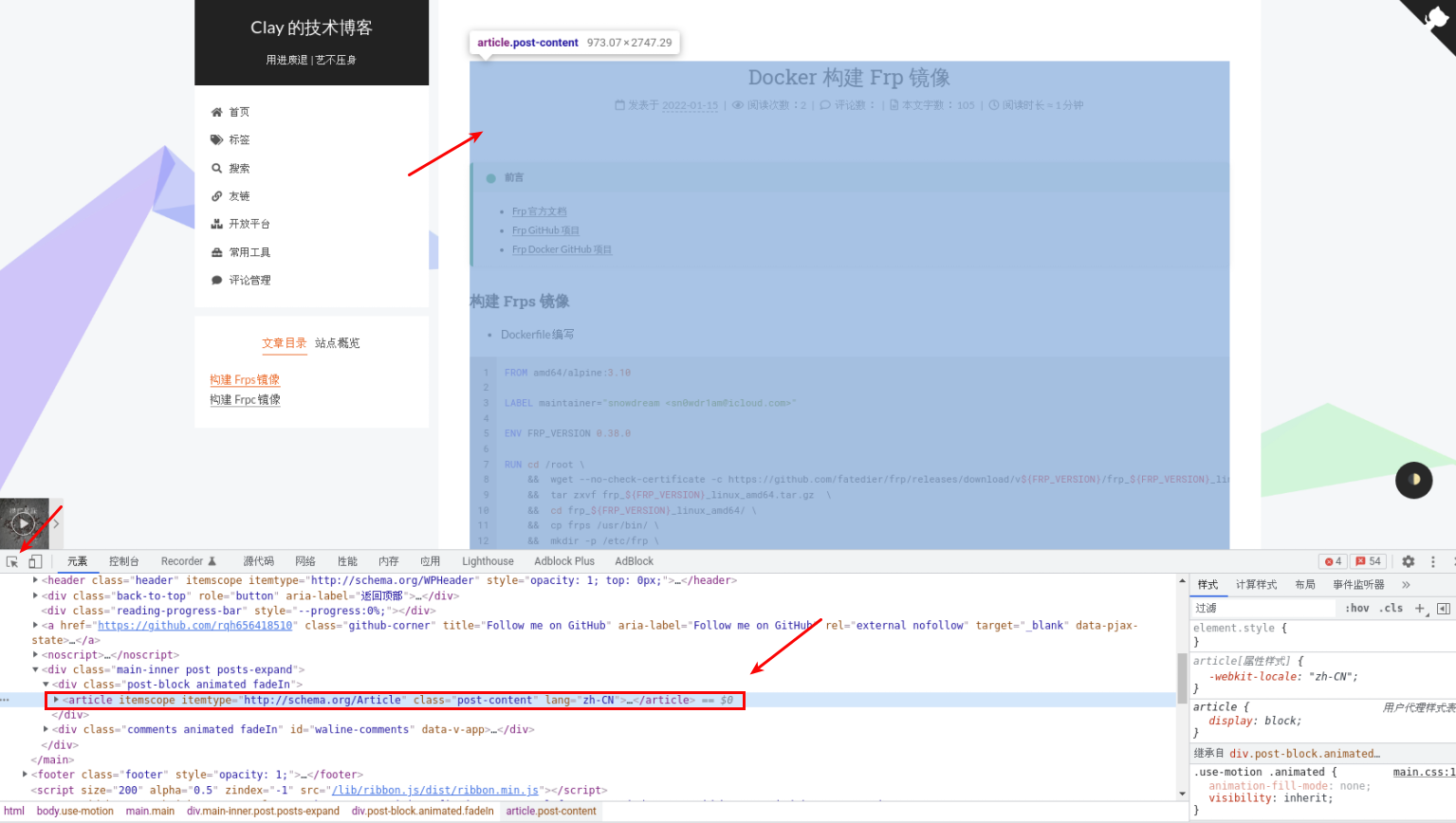 另一种定位方式是打开你博客的任意一篇文章,利用 Chrome 等浏览器的元素审查功能,找到文章页面中文章主体的标签元素,比如下图中的 article 就是文章主体的标签元素: